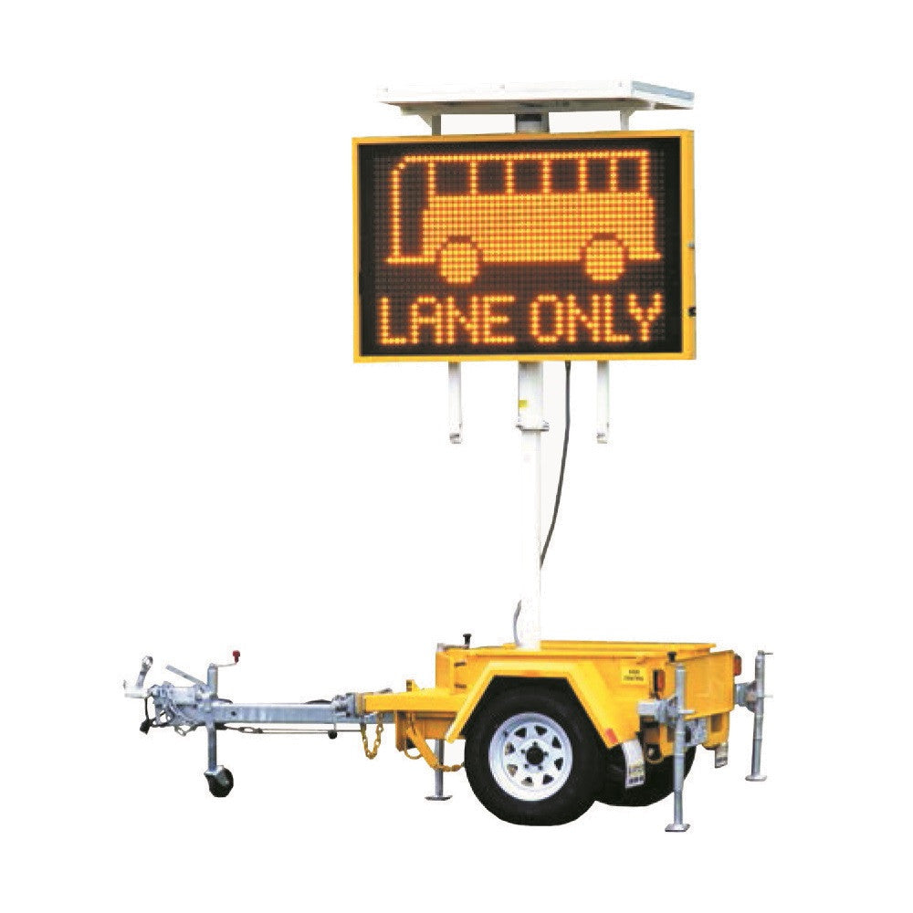 A trailer mounted, variable message board with amber colouring for words and images.