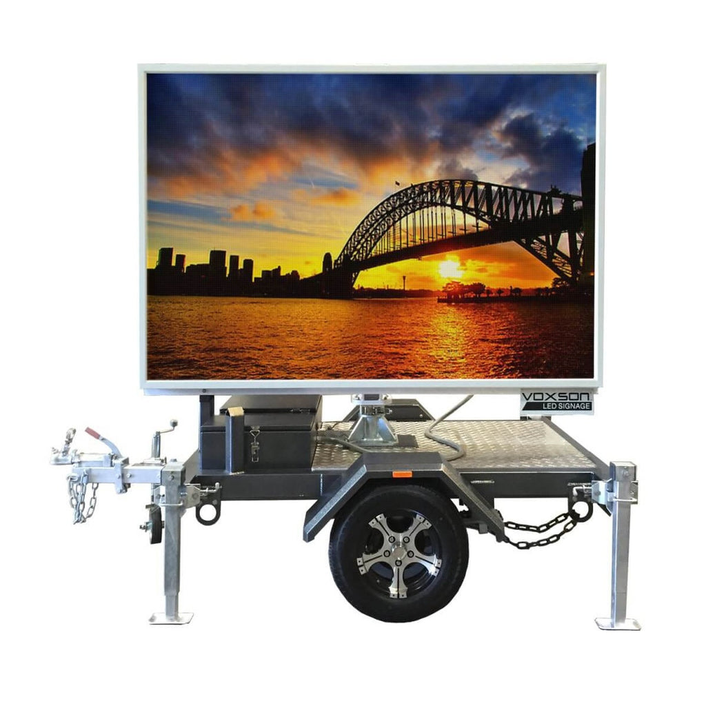 A trailer mounted, variable message board with hi-resolution LED screen, capable of showing high definition movies, and TV.
