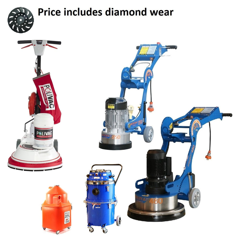 Hire package includes 250mm floor grinder, 480mm floor grinder, Polivac floor polisher, vacuum cleaner with dust separator, and 1mm of diamond wear per day, or 5mm per week.