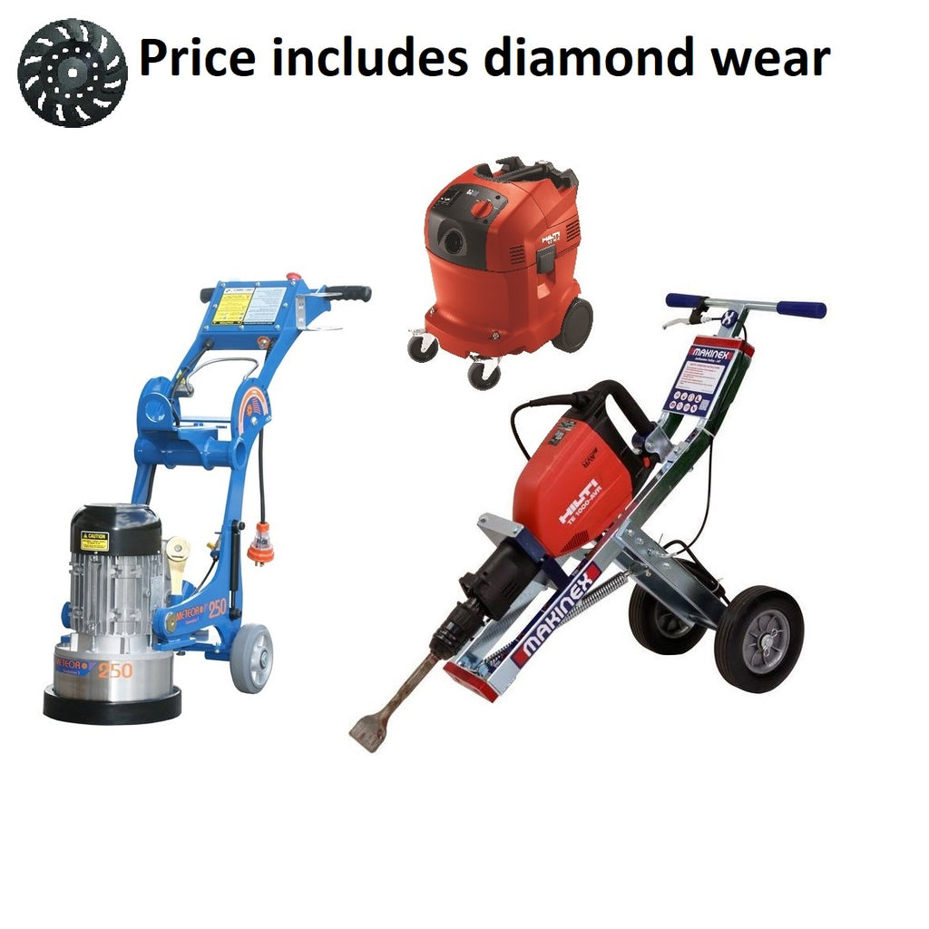 A heavy duty Hilti jackhammer on trolley with tile-lifting bit for large area tile removal. An aggressive floor grinding machine for removing coatings and preparing concrete surface for coatings. This machine will remove paint, epoxy and adhesives, exposed aggregate, and grind surface imperfections.