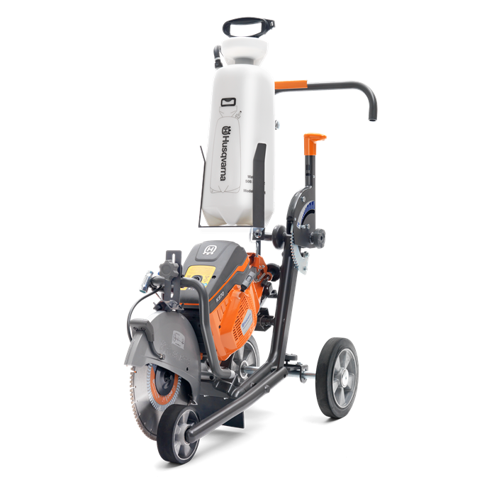 A lightweight trolley used to support a demolition saw (350mm and 400mm) for cutting concrete. Cutting depth adjustment from the handles.